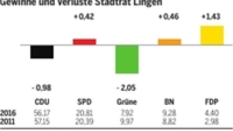 Lingen. Bei der Kommunalwahl am Sonntag in Lingen hat die CDU 56,17 Prozent der Stimmen erreicht, etwas weniger als 2011 (57,15). Die SPD kam auf 20,81 Prozent und legte damit gegenüber 2011 (20,3) leicht zu. Die Grünen mussten Verluste von über zwei Prozent hinnehmen und kamen auf 7,92 Prozent. Mit 4,40 Prozent der Stimmen hat die FDP um 1,4 Prozent zugelegt. Die Bürgernahen konnten ihr Ergebnis von 2011 (8,82 Prozent) leicht steigern. Sie kamen auf 9,28 Prozent.